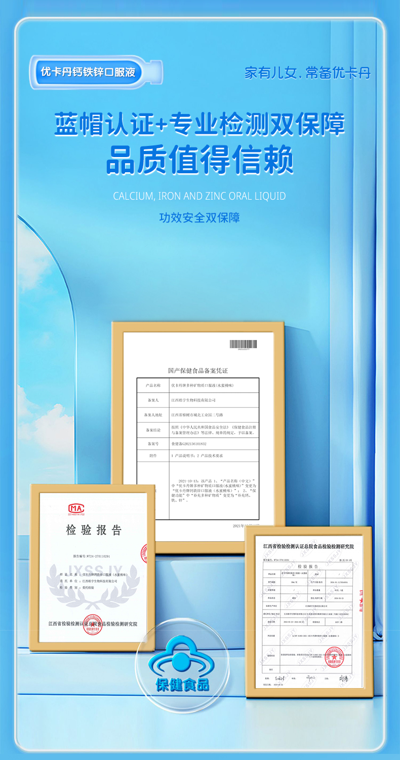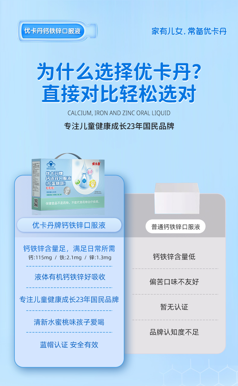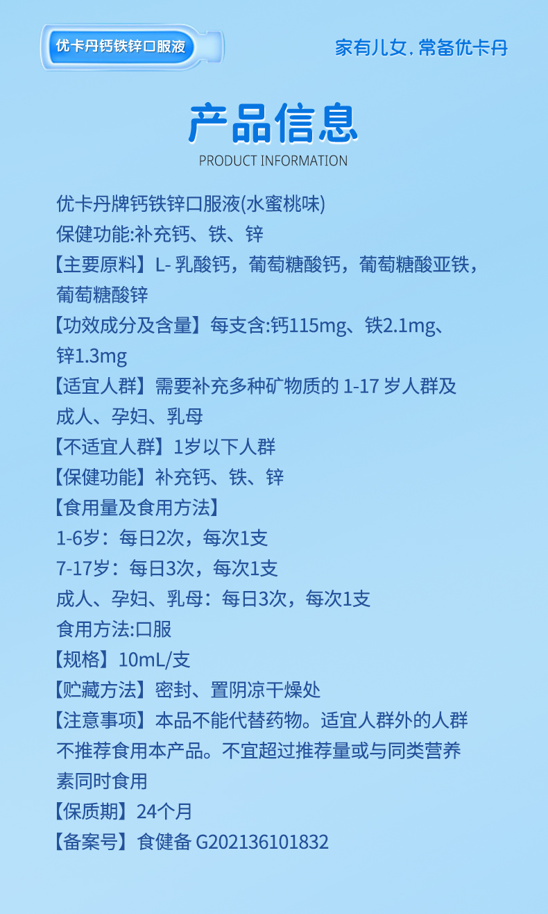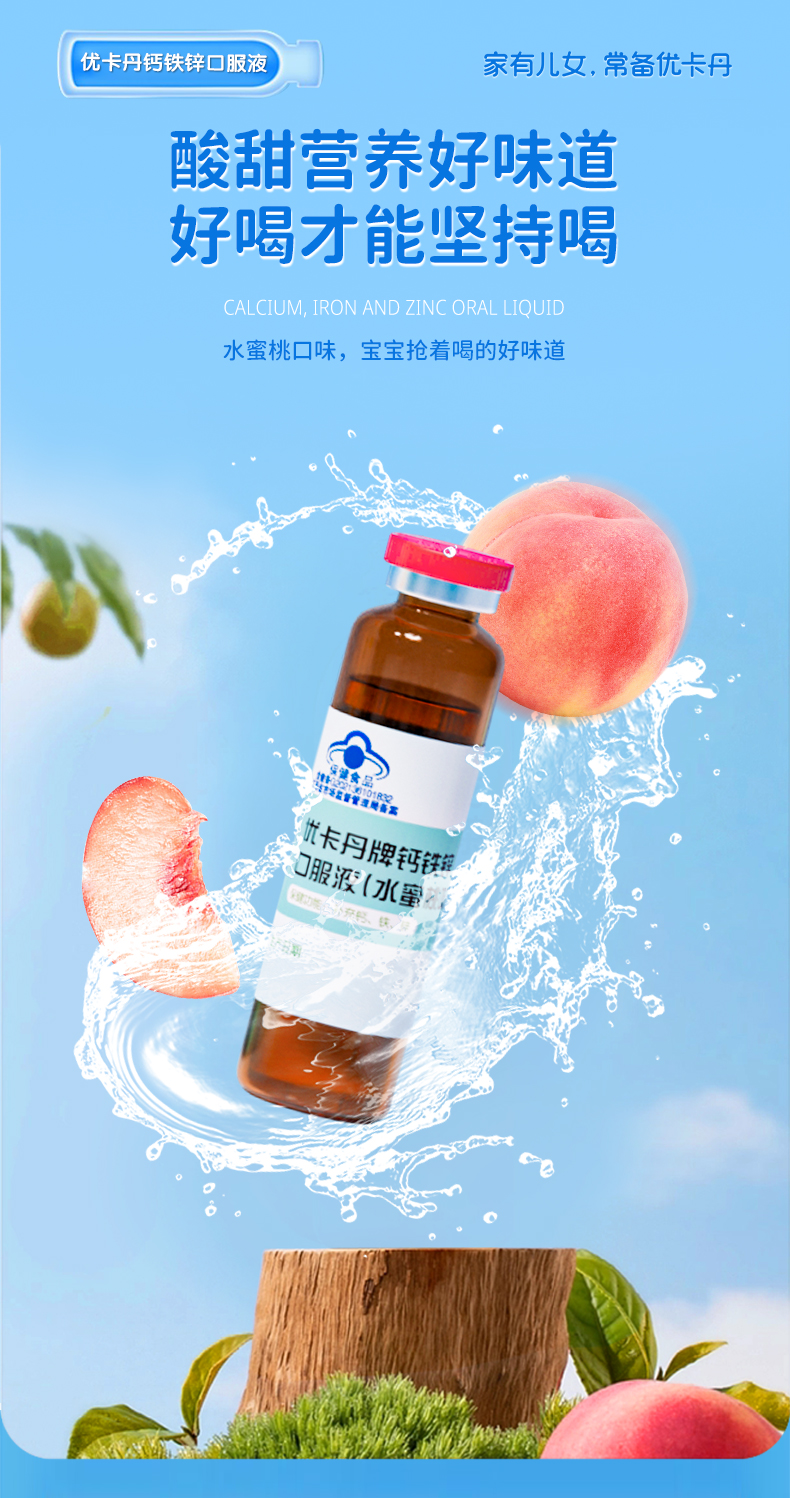 產品名稱:優卡丹牌鈣鐵鋅口服液(水蜜桃味)