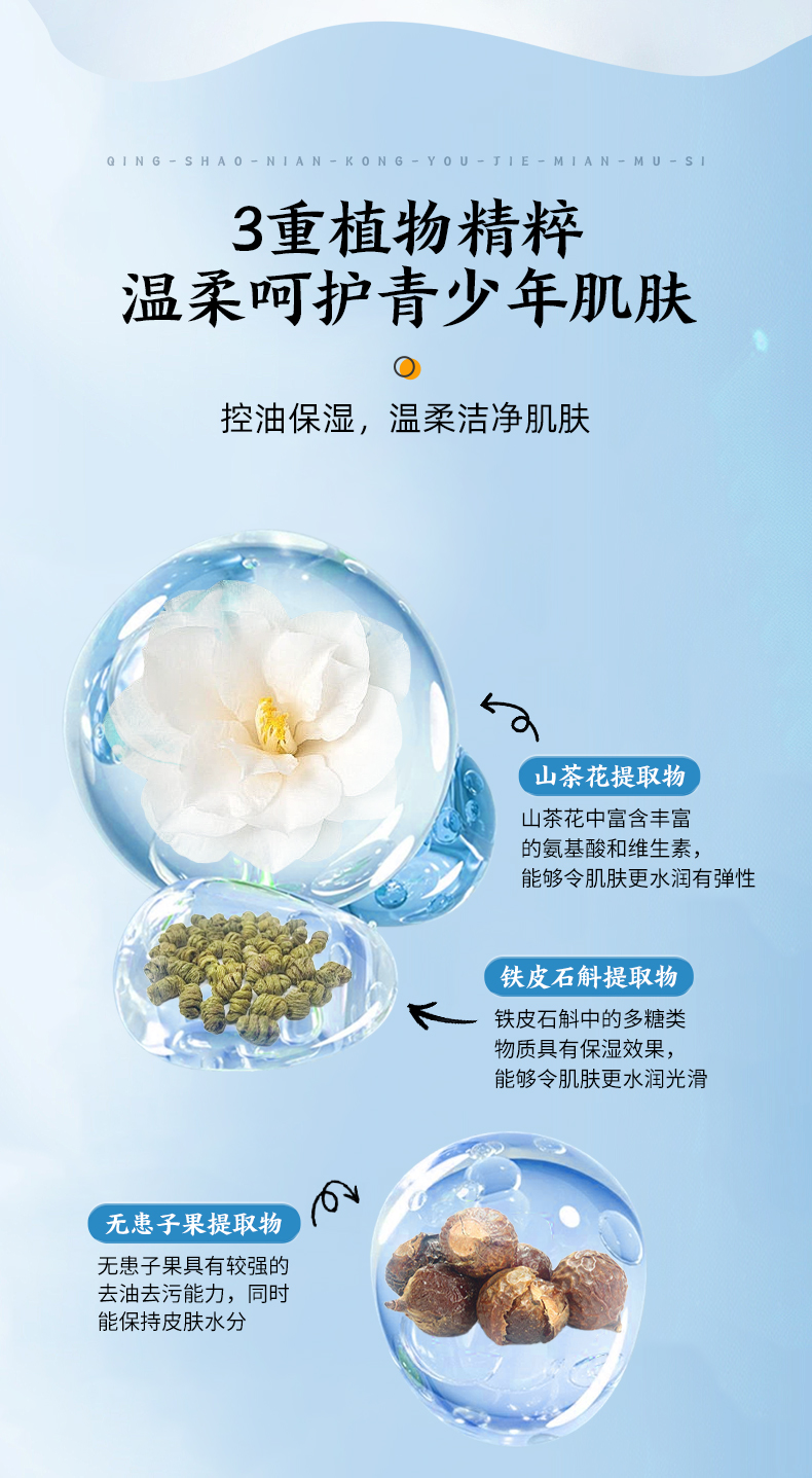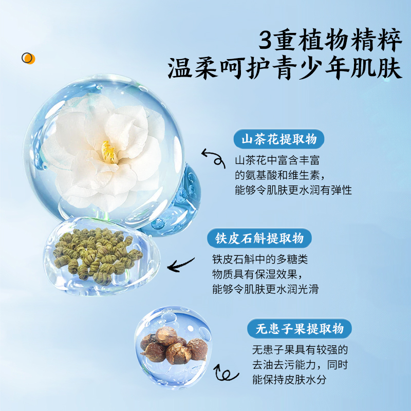 產品成分:月桂酰肌氨酸鈉、癸基葡糖苷、山茶花提取物、鐵皮石斛提取物、無患子果提取物等。