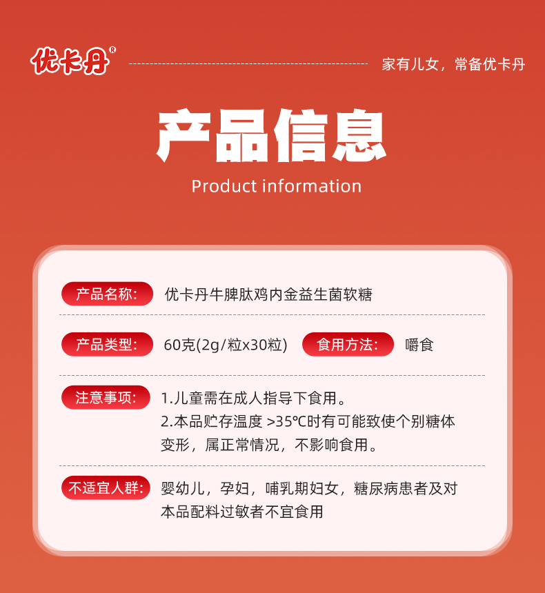 【產(chǎn)品名稱】?jī)?yōu)卡丹牛脾肽雞內(nèi)金益生菌軟糖