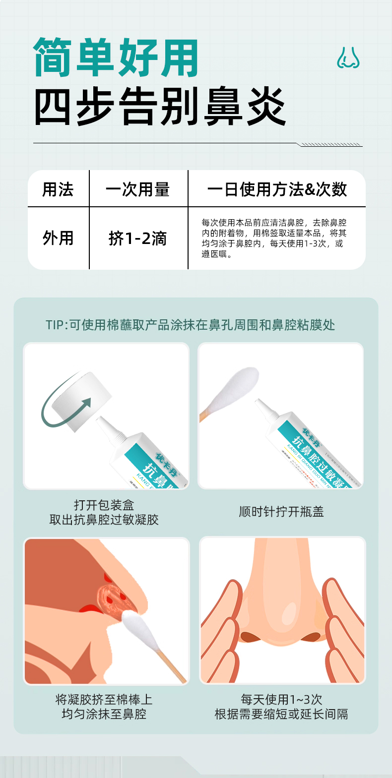 【使用方法】 每次使用本品前應(yīng)清潔鼻腔,去除鼻腔內(nèi)的附著物,用棉簽取適量本品,將其均勻涂于鼻腔內(nèi),每天使用1-3次,或遵醫(yī)囑。