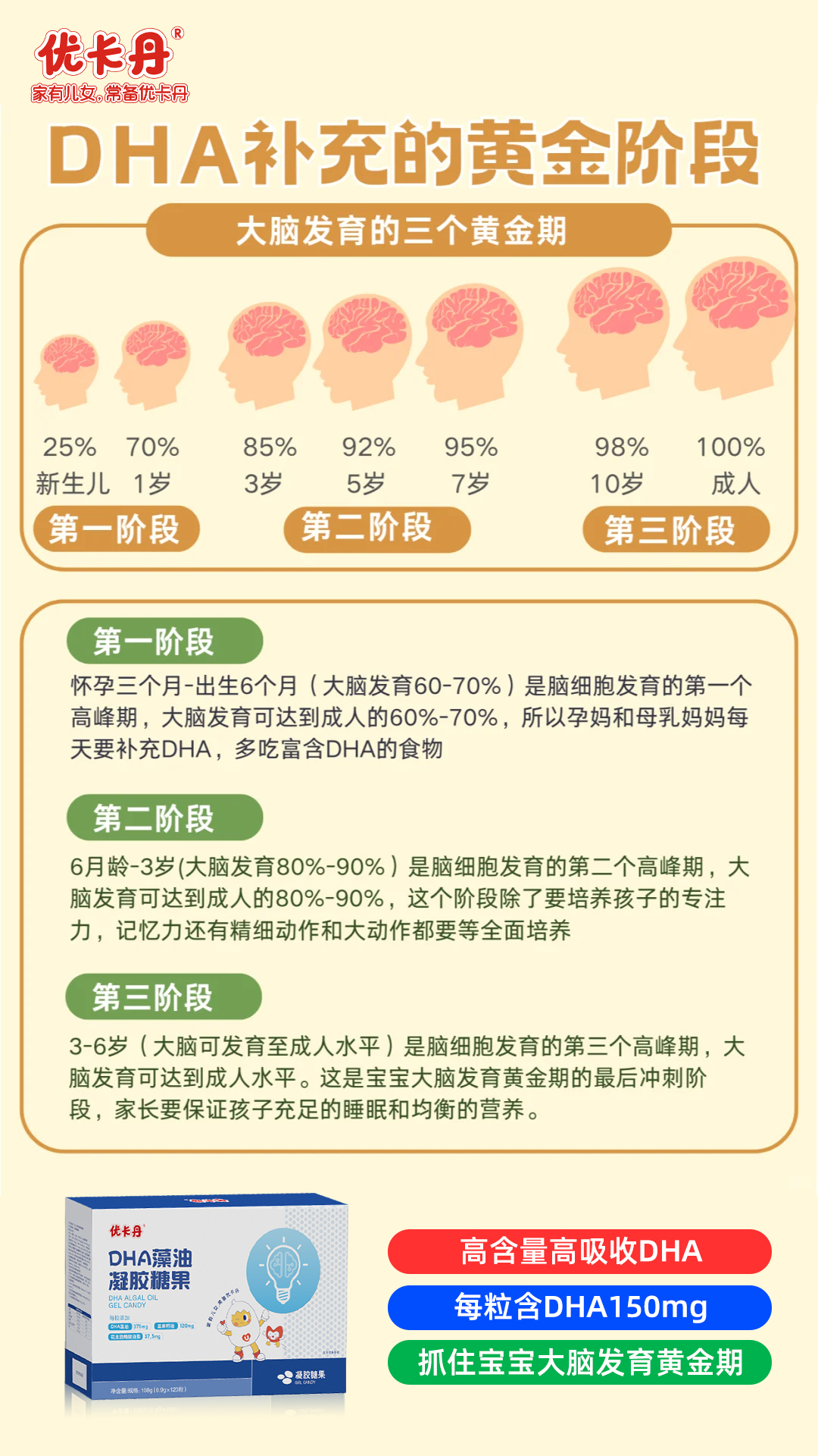 DHA補充圖解|一張圖帶你了解補充DHA的關鍵期 發布時間:2025-11-05 11:23:13 瀏覽量:70 您知道嗎?寶寶大腦發育的黃金期,一生只有一次。從出生到3歲,大腦發育將完成成人大腦的近90%,這是一個不可逆的迅猛過程。在此階段為寶寶及時補充足量的DHA,就如同為他鋪設最關鍵的“聰明基石”,這份早期的營養投入,將轉化為他未來探索世界的無限潛能。家有兒女,常備優卡丹。