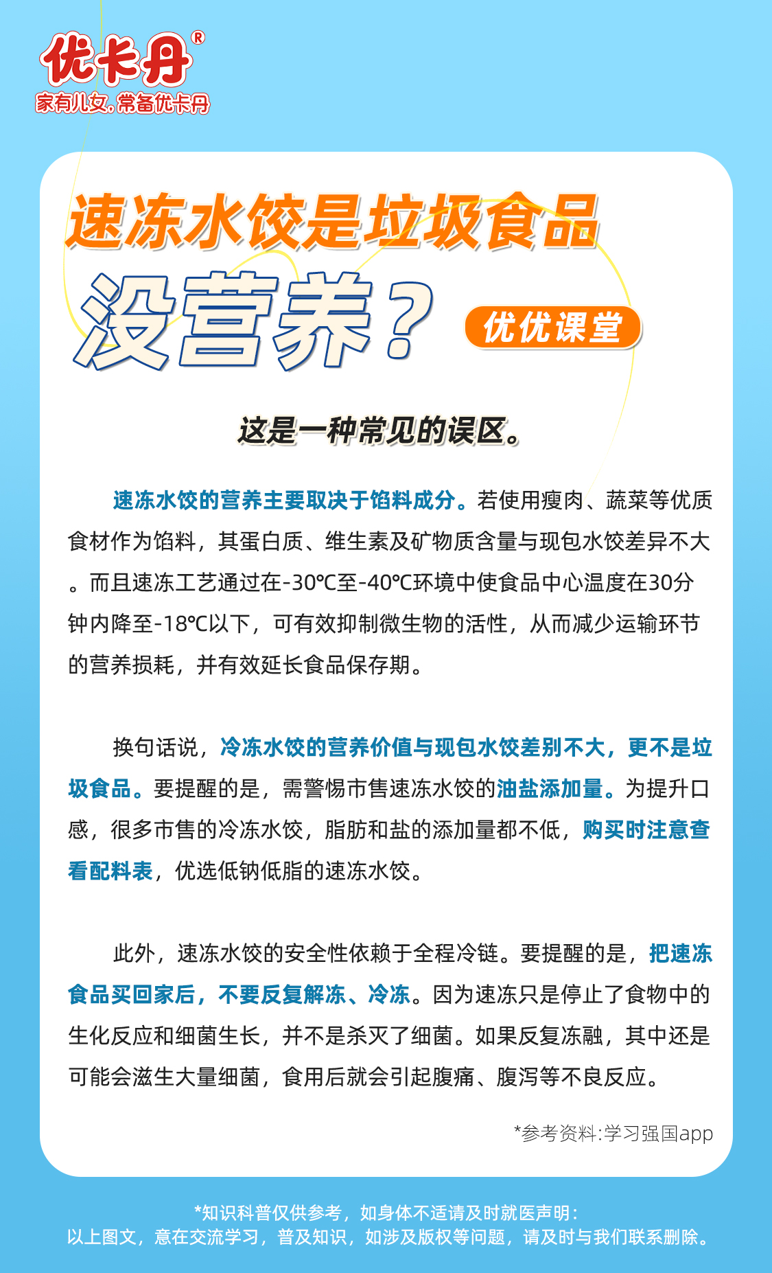 優優課堂│速凍水餃是垃圾食品,真的假的? 發布時間:2025-12-06 15:33:49 瀏覽量:330 在快節奏的都市生活中,速凍水餃常被貼上“方便但沒營養”的標簽,甚至被簡單歸為“垃圾食品”。事實果真如此嗎?今天,優卡丹營養專家就從營養成分上專業解析速凍水餃是不是垃圾食品?