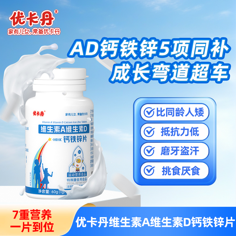 優卡丹維生素A維生素D鈣鐵鋅片,不止補充AD,同時將7種關鍵營養科學整合,AD鈣鐵鋅五項同補,打造出更適合兒童成長的“黃金配方”,讓營養補充更強勁有力,即使秋冬發育也不“受阻”。