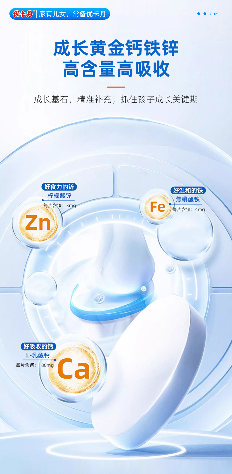 同時,通過科學的配比與工藝,讓每一片優卡丹維生素A維生素D鈣鐵鋅片精準補充寶寶所需的營養素,抓住成長關鍵期。