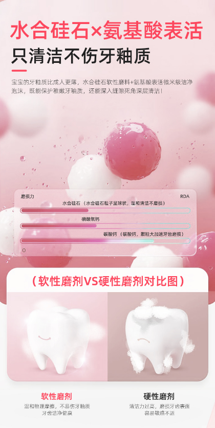 優(yōu)卡丹深知兒童口腔的嬌嫩特性,因此在強效防護的同時,特別注重配方的溫和性。選用更溫和的水合硅石作為摩擦劑,搭配氨基酸表面活性劑:清潔力足夠,能有效去除牙菌斑和食物殘渣。