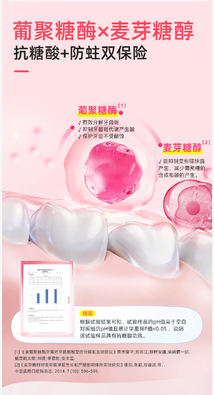 葡聚糖酶能有效分解牙菌斑基質(zhì),破壞牙菌斑結(jié)構(gòu),抑制其代謝產(chǎn)生酸,從而保護牙齒不受酸蝕侵害。